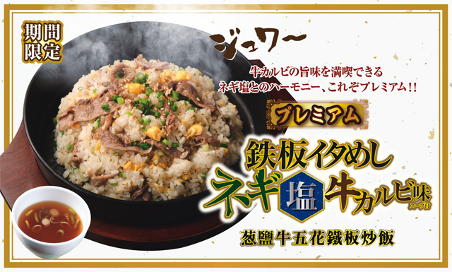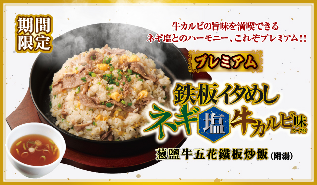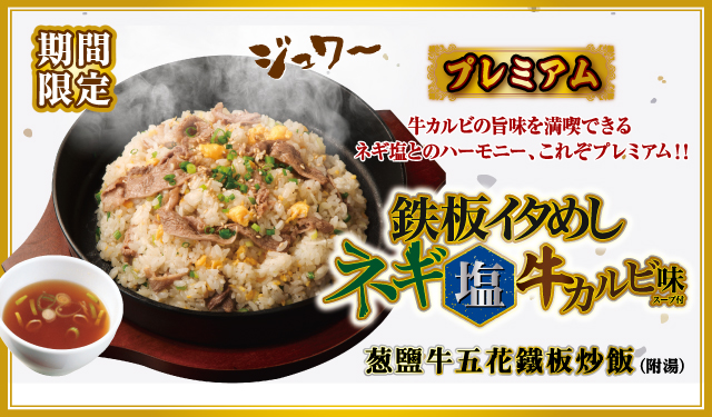 熱滋滋的鐵板上,牛五花與各式配料:金黃蛋液、白芝麻、蔥花、晶瑩米飯熱鬧的翻滾著,伴著柚子絲散發微微清香,淋上特調鹽味醬汁,香氣四溢,強勢新登場!