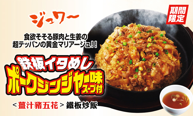 特選豬五花與青蔥、雞蛋等各式食材在鐵板上熱鬧的拌炒著,再淋上特製清爽的薑汁醬油,超完美的黃金拍檔就此誕生!