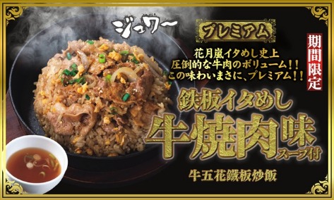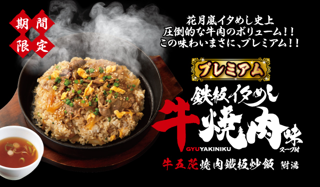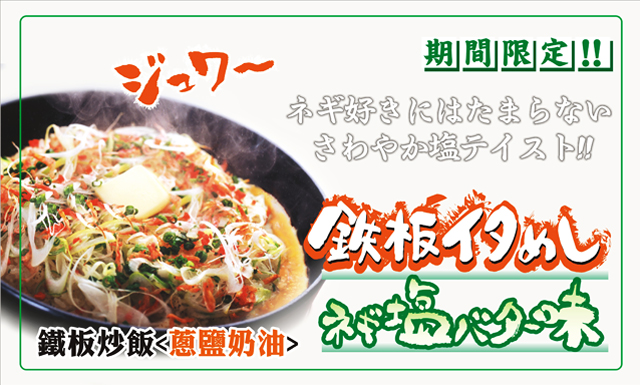叭哩叭哩的鐵板飯上鋪滿爽脆的蔥絲和櫻花蝦,加入風味濃郁的特製醬汁一同拌炒,日本花月嵐鐵板炒飯的NO.1,推薦您品嚐!