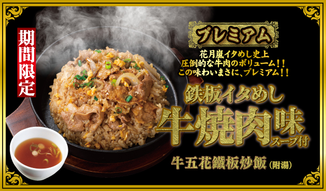 大片大片的特選豬五花搭配雞蛋、蔥花與晶瑩米飯,淋上特調鹽味醬,在鐵板上豪邁爽快的拌炒!花月嵐推薦您品嚐!