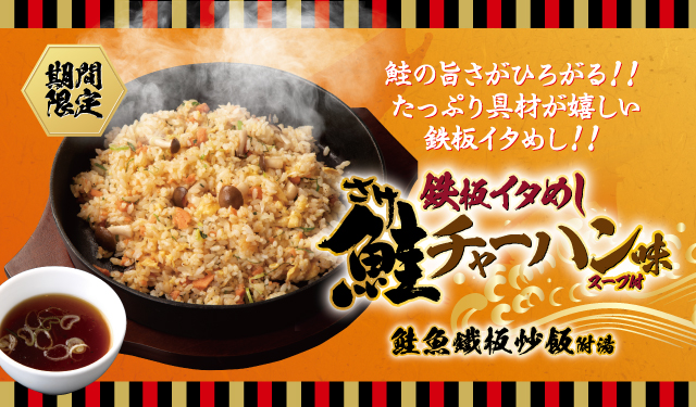 首次登場的鮭魚鐵板炒飯,質地濕潤的鮭魚鬆加入鴻喜菇增加口感,新鮮紫蘇葉的清香中和了鮭魚的鹹香,淋上特調醬汁,鹹甜爽口香氣誘人!