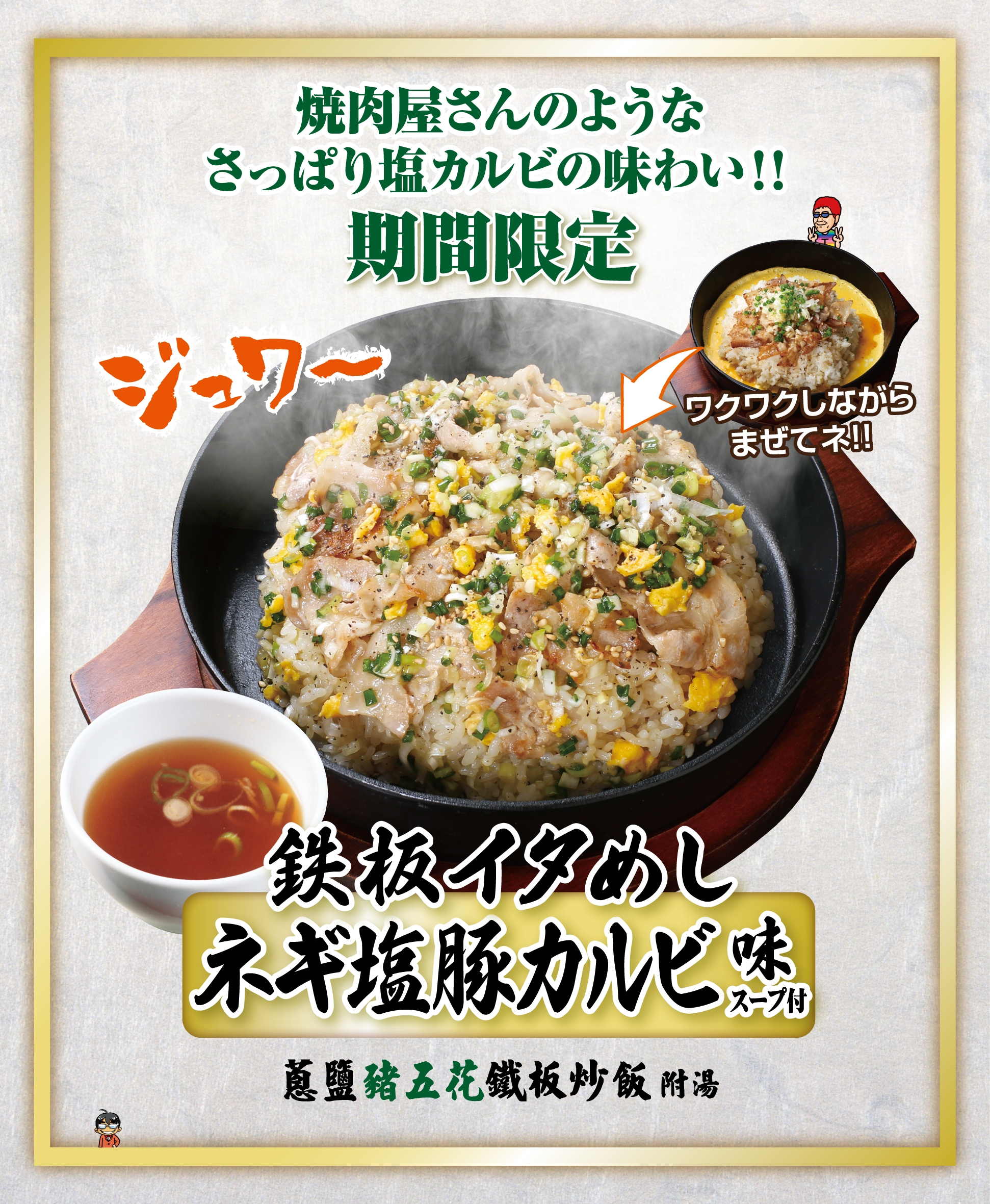蔥鹽豬五花鐵板炒飯 (附湯) 大片大片的特選豬五花搭配雞蛋、蔥花與晶瑩米飯,淋上特調鹽味醬,在鐵板上豪邁爽快的拌炒!花月嵐推薦您品嚐!! ◎蔥鹽豬五花鐵板炒飯(附湯)......NT$210 1/28(三)起登場 過敏原及含牛成分情報查詢 過敏原: