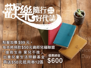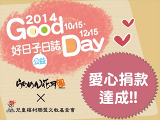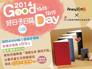 2014 いいね!好日子日誌,每一天都有好事發生2014 いいね!好日子日誌,每一天都有好事發生花月嵐《2014 いいね!好日子日誌》,點餐加價$99元,每本將捐款$50元資助兒福聯盟「搶救生命 棄兒不捨」出養兒童生活照顧基金。再附贈總值$600元的$50元抵用券12張作為謝禮。 -