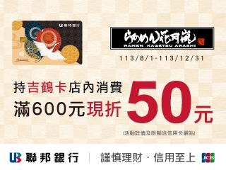 持聯邦銀行JCB日本吉鶴信用卡支付,消費滿600元現折50元!