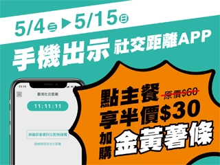 5/4-5/15,手機出示社交距離APP,點主餐享優惠!