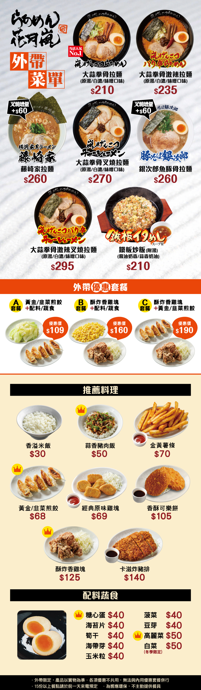 【外帶優惠套餐】 A套餐:黃金/韭菜煎餃+配料/蔬食 特價$109 B套餐:酥炸香雞塊+配料/蔬食 特價$160 C套餐:酥炸香雞塊+黃金/韭菜煎餃 特價$190 ‧各項優惠不共用,外帶限定,無法與內用優惠套餐併行。