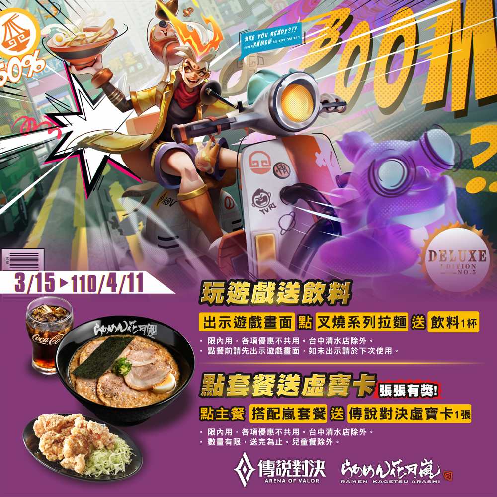 3/15-4/11 第1彈 出示「傳說對決」遊戲畫面並點叉燒系列 送【飲料】1杯 第2彈 點【主餐+嵐套餐】可獲得【傳說對決虛寶卡】1張 ‧各項優惠不共用,限內用 ‧台中清水店不適用。 ‧虛寶卡數量有限,送完為止