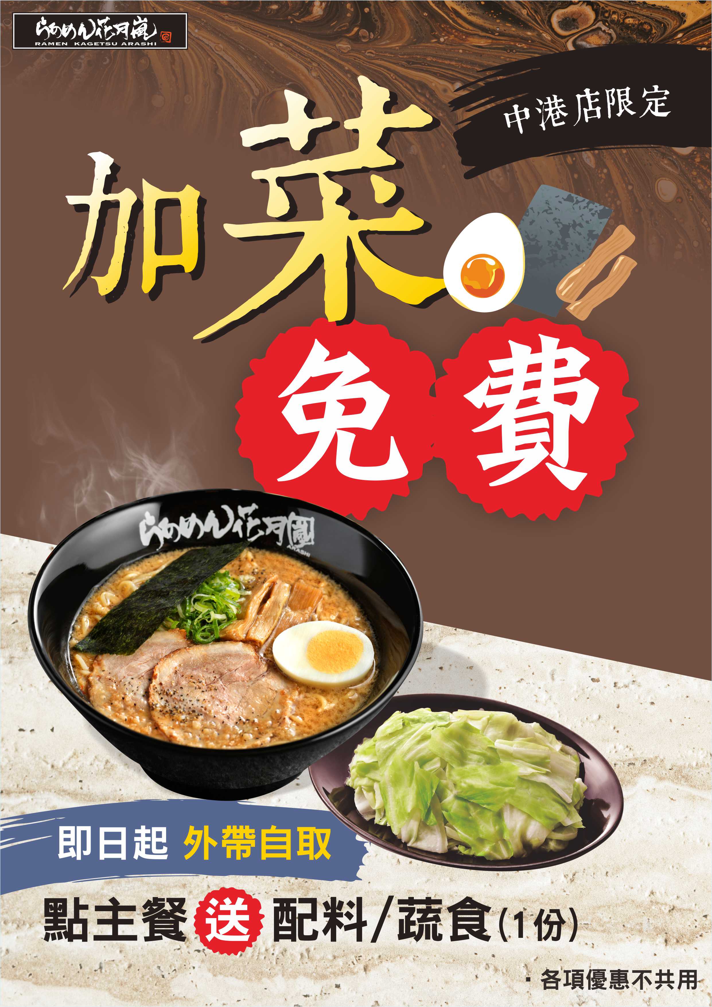 即日起外帶自取,點主餐送配料/蔬食(1份)