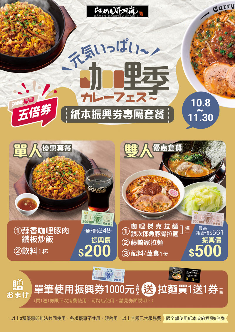 ○振興券1000元:單筆消費滿1000元(含以上)送拉麵買1送1券