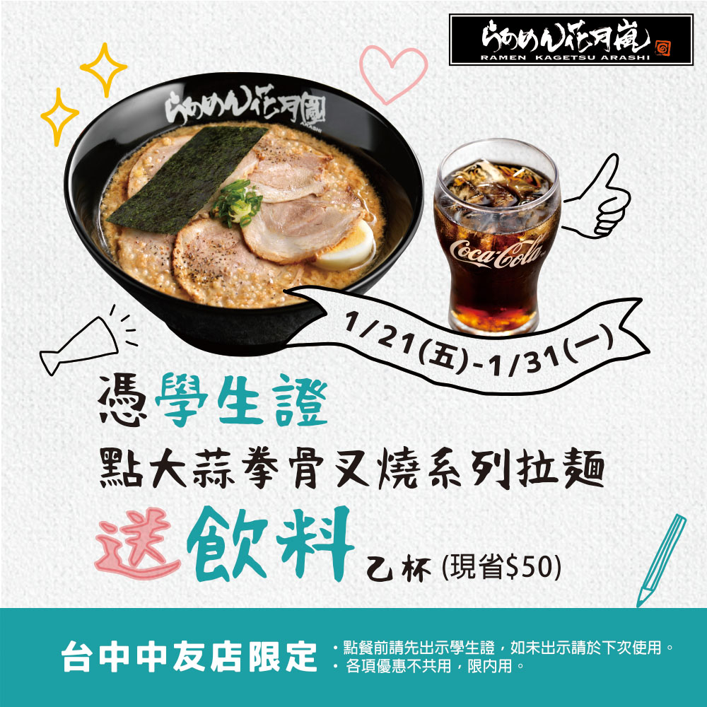 活動期間: 1/21(五)-1/31(一) 憑學生證,點大蒜拳骨叉燒系列拉麵 送飲料乙杯(現省$50) ‧ 點餐前請先出示學生證,如未出示請於下次使用 ‧ 各項優惠不共用,限內用。 ‧ 台中中友店限定。 ----------------------------