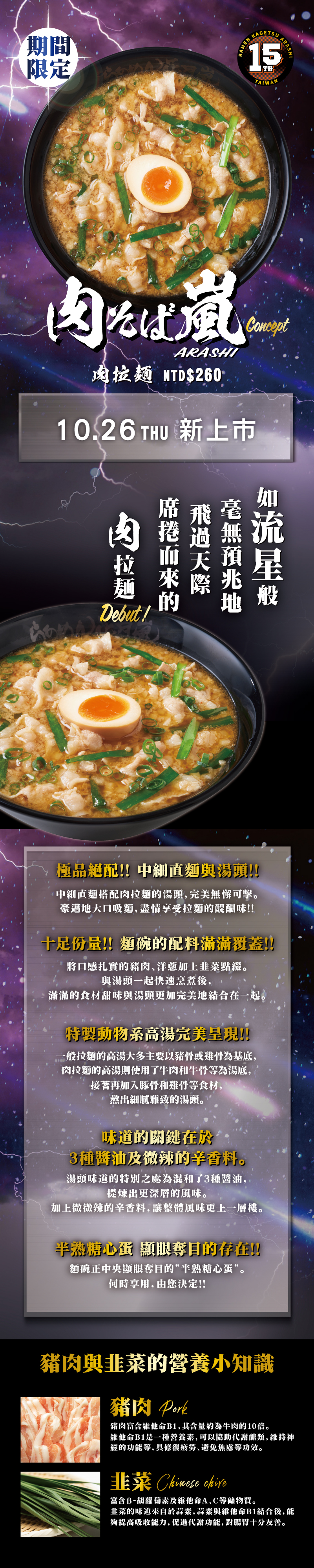 【肉拉麵 限定登場】 特製動物系高湯(牛肉、豚骨、雞骨)中放入豬肉、洋蔥丁、韭菜疊出不同層次, 搭配出色的半熟味玉,爽度大增 ! ※ 肉拉麵 NT$260 . 10/26 (四)登場! *餐點食材如有調整將以現場提供為主 本店消費另收10%服務費