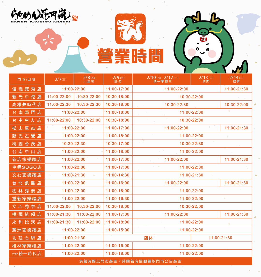 2024新春期間營業時間