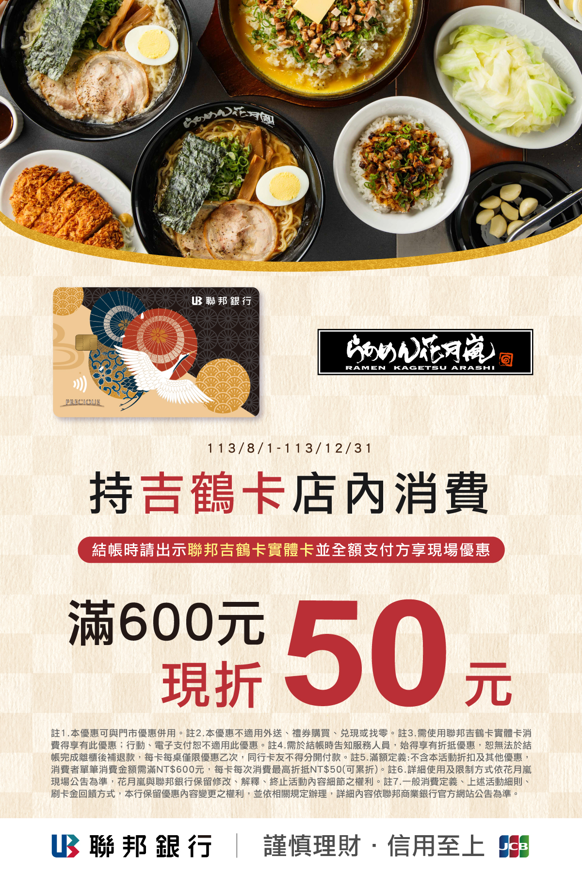 花月嵐消費,持聯邦銀行JCB日本吉鶴信用卡支付, 消費滿600元現折50元, 滿1200元現折100元,以此類推,現折無上限之優惠。 一、可與店內其它優惠併用,單筆發票限折乙次。 二、需使用聯邦銀行JCB吉鶴信用卡實體卡消費得享有此優惠;行動、電子支付不適用此優惠。 三、需於結帳時告知服務人員,始得享有折抵優惠,恕無法於結帳完成離櫃後補退款,每卡每桌僅限優惠乙次,同行卡友不得分開付款。 四、本優惠不適用外送、禮券購買、兌現或找零。 五、品牌與合作金庫銀行保留修改、解釋、終止活動內容細節之權利。