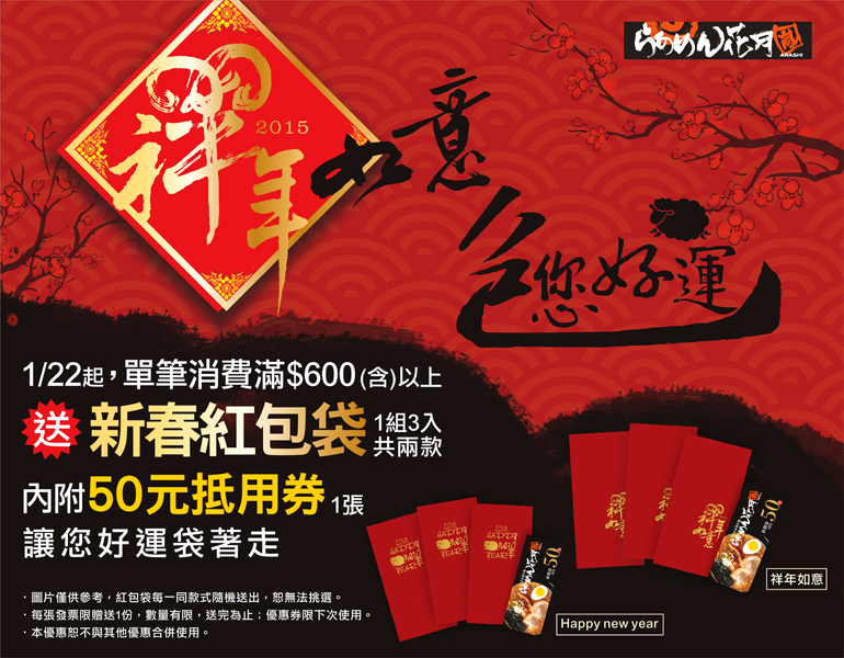 *活動已結束* │祥年如意‧包您好運│ 2015/1/22起,單筆消費滿$600(含)以上,送新春紅包袋(1組3入),內附50元抵用券1張,讓您好運袋著走。 {新春紅包袋‧共兩款} ‧圖片僅供參考,紅包袋每一同款式隨機送出,恕無法挑選。 ‧每張發票限贈送1份,數量有限,送完為止;優惠券限下次使用。 ‧本優惠恕不與其他優惠合併使用。
