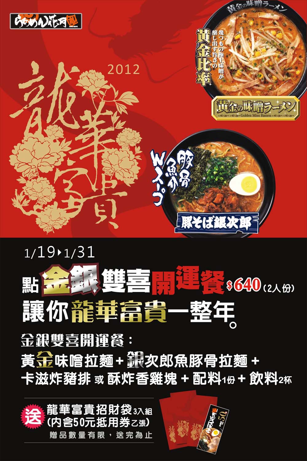 2012 / 1 / 19 ~ 1 / 31 點<金銀雙喜開運餐> $640 / (2人份) 讓你龍華富貴一整年 點金銀雙喜開運餐: 黃金味噌拉麵+銀次郎魚豚骨拉麵+卡滋炸豬排或酥炸香雞塊+配料1份+飲料2杯 送<龍華富貴招財袋>3入組,內含50元抵用券乙張 ‧贈品數量有限‧送完為止 ‧活動詳情請洽門市