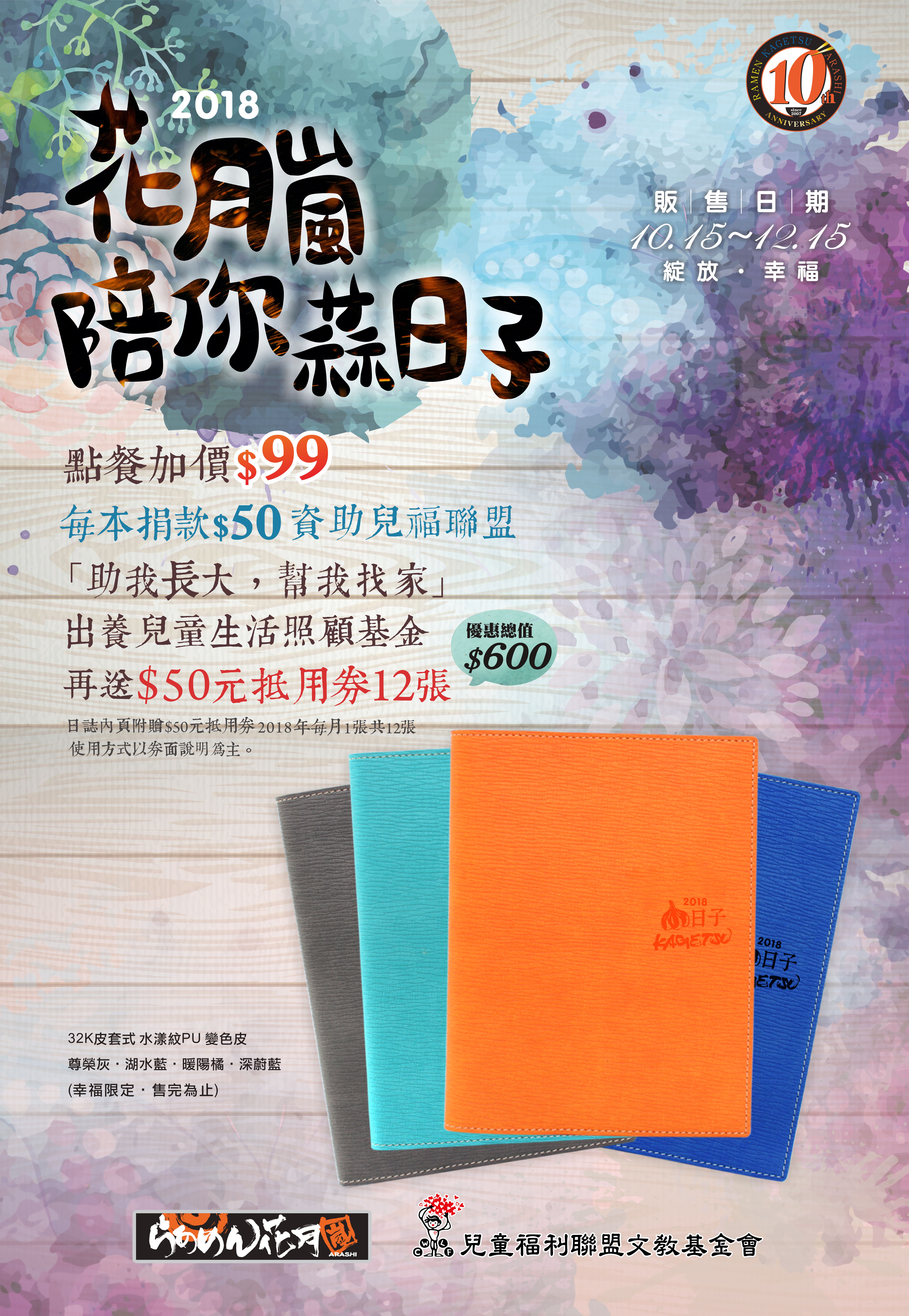 10/15~12/15到花月嵐享受濃郁美味的拉麵時,即可以加$99元購買《2018花月嵐陪你蒜日子 》,每本我們將捐款$50元做為兒福聯盟「助我長大,幫我找家」出養兒童生活照顧基金。並附贈總值$600元的抵用券作為謝禮。