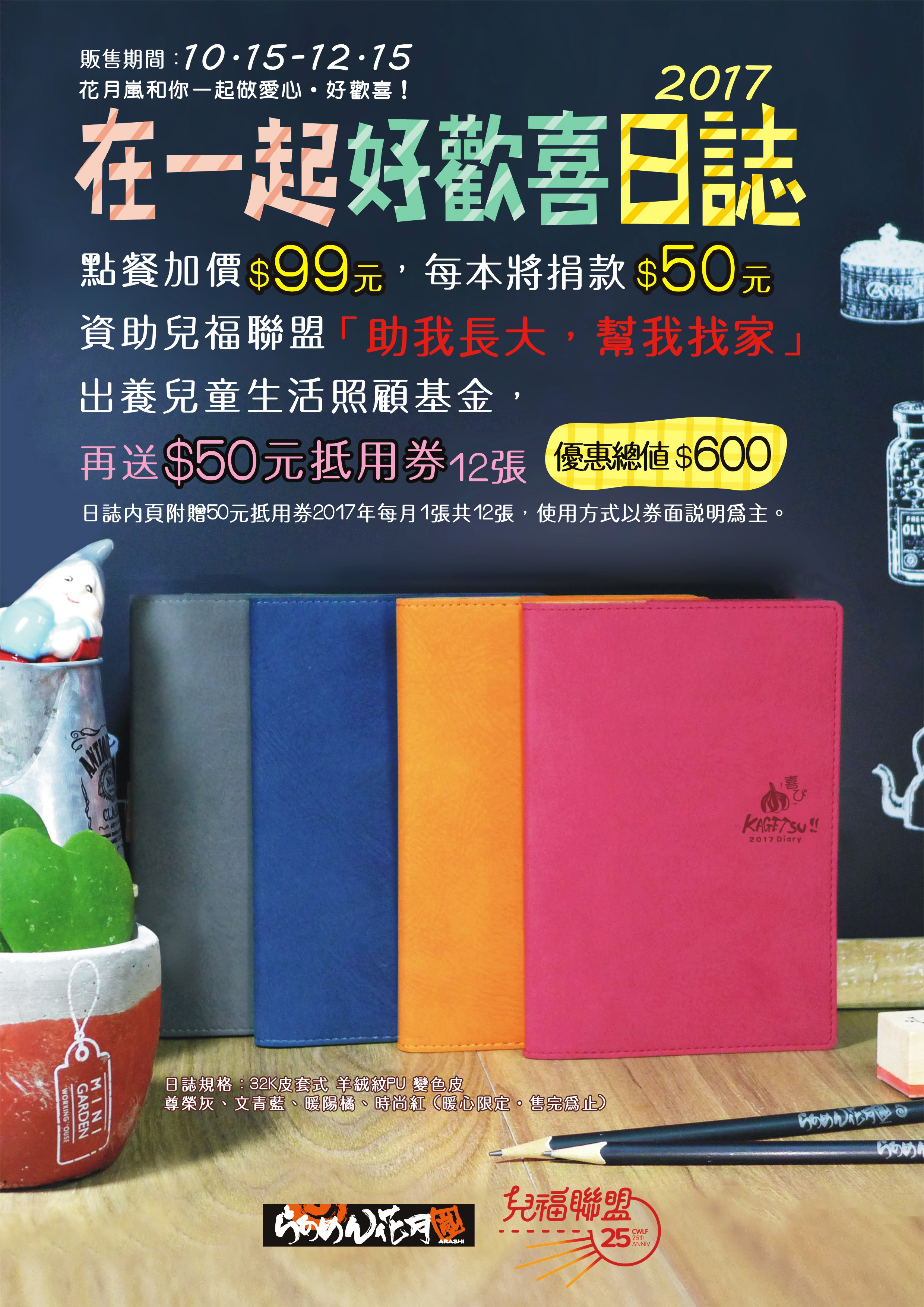 10/15~12/15到花月嵐享受濃郁美味的拉麵時,即可以加$99元購買《2017在一起好歡喜日誌 》,每本我們將捐款$50元做為兒福聯盟「助我長大,幫我找家」出養兒童生活照顧基金。並附贈總值$600元的抵用券作為謝禮。