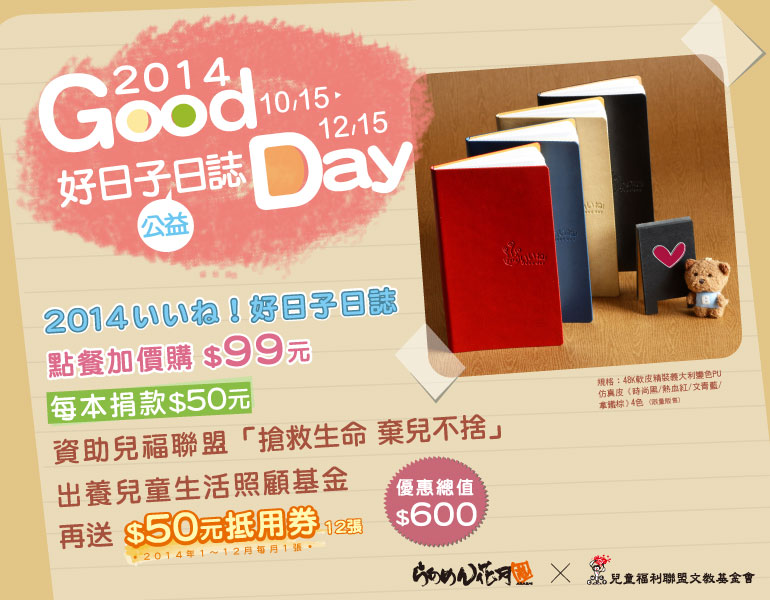 花月嵐《2014 いいね!好日子日誌》,點餐加價$99元,每本將捐款$50元資助兒福聯盟「搶救生命 棄兒不捨」出養兒童生活照顧基金。再附贈總值$600元的$50元抵用券12張作為謝禮。