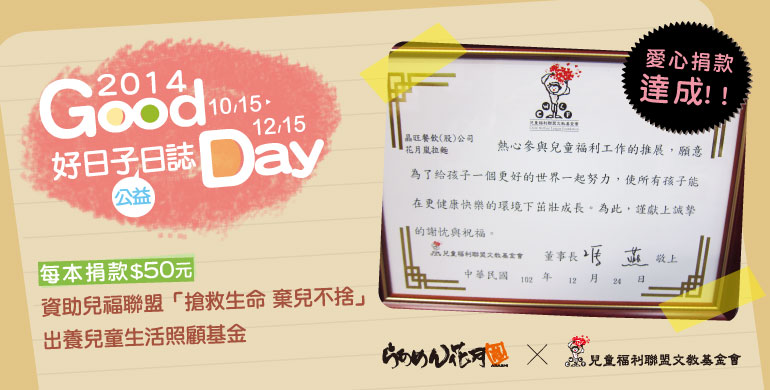 花月嵐2014好日子公益日誌2,000本圓滿完售,感謝大家的愛心! 這次共捐出10萬元善款與無限的愛至兒福聯盟「搶救生命棄兒不捨」專戶。 感謝兒福聯盟對孩子們的盡心盡力,更感謝每位支持的客人們, 願大家的心意都化為力量,2014年讓我們一起繼續愛孩子,幫助他們創造更好的未來!