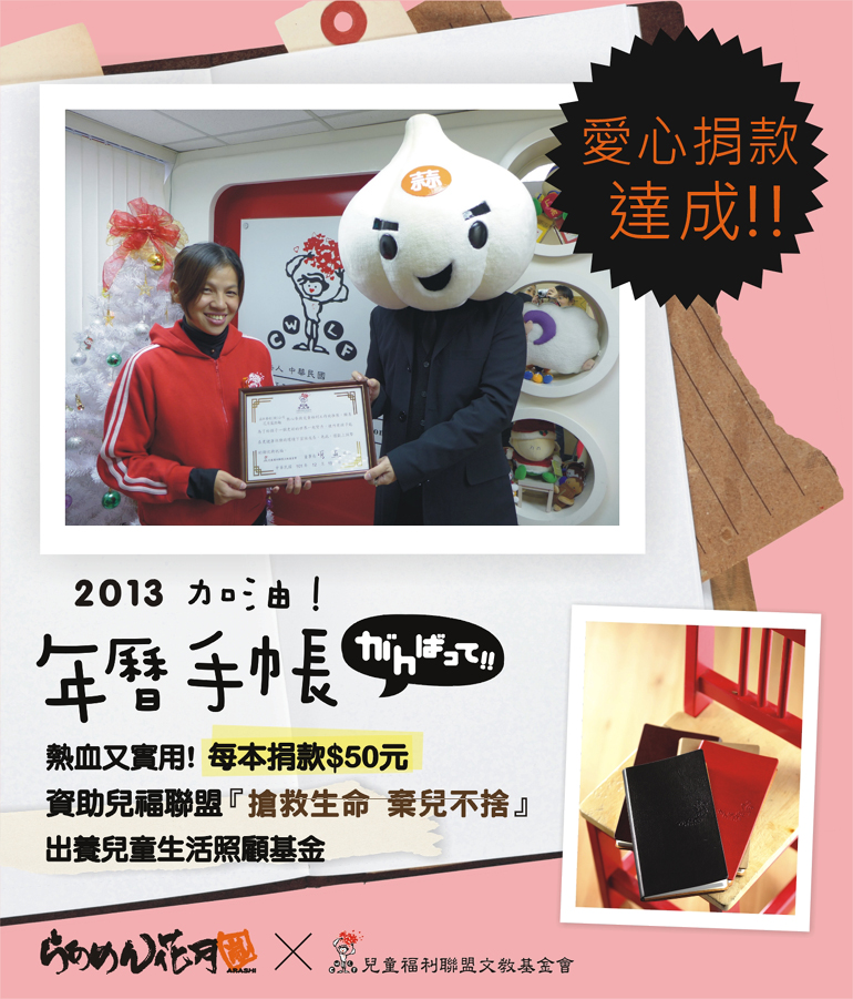 花月嵐2013公益手帳2,000本圓滿完售,感謝大家的愛心!