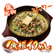 叭哩叭哩的鐵板上,金黄蛋液、奶油、叉燒丁、蔥花與白飯跳著舞翻滾,淋上祕傳醬油,撲鼻的香氣魅力無敵,的口感也大受歡迎,是花月嵐最推薦的附餐,可以選擇再添加自己喜愛的配料,調配出專屬的原創鐵板炒飯。