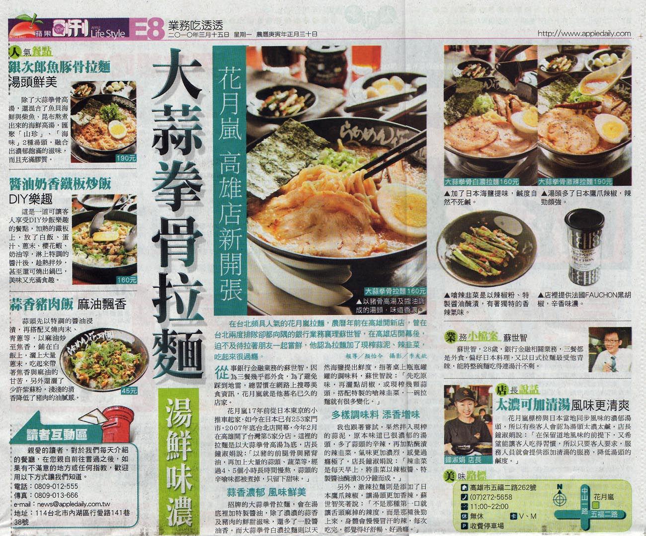 在台北頗具人氣的花月嵐拉麵,農曆年前在高雄新開店,曾在台北兩度排隊卻都向隅的銀行業務襄理蘇世智,在高雄開幕後,迫不及待拉著朋友一起嘗鮮,他認為拉麵加了現榨蒜泥、辣韭菜,吃起來很過癮。