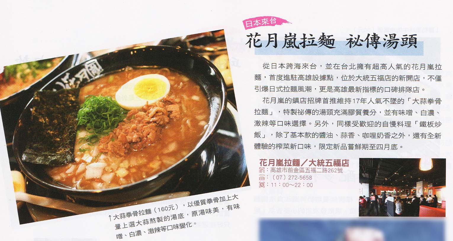 從日本跨海來台,並在台北擁有超高人氣的花月嵐拉麵,首度進駐高雄設據點,位於大統五福店的新開店,不僅引爆日式拉麵風潮,更是高雄最新指標的口碑排隊店。 花月嵐的鎮店招牌首推維持17年人氣不墜的「大蒜拳骨拉麵」,特製秘傳的湯頭充滿膠質養分,並有味噌、白濃、激辣等口味選擇。 另外,同樣受歡迎的自慢料理「鐵板炒飯」,除了基本款的醬油、蒜香、咖哩奶香之外,還有全新體驗的榨菜新口味,限定新品嘗鮮期至四月底。