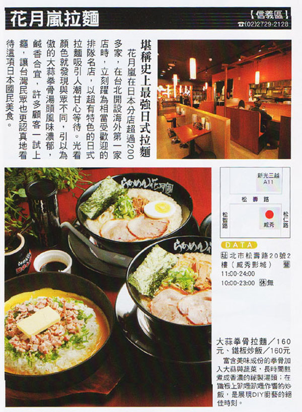 花月嵐在日本分店超過200多家,在台北開設海外第一家店時,立刻躍為相當受歡迎的排隊名店,以超有特色的日式拉麵吸引人潮甘心等待。 光看顏色就發現與眾不同,引以為傲的大蒜拳骨湯頭風味濃郁,鹹香合宜,許多顧客一試上癮,讓台灣民眾也更認真地看待這項日本國民美食。