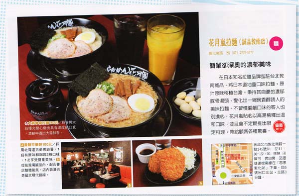在日本知名拉麵品牌進駐台北敦南誠品,將日本道地重口味拉麵,原汁原味移植台灣。 秉持其自豪的濃郁豚骨湯頭,變化出一碗碗香醇誘人的美味拉麵。 不習慣偏鹹口味的客人也別擔心,花月嵐貼心以高湯稀釋出溫和口味,並且會不定期推出限定料理,帶給顧客各種驚喜。