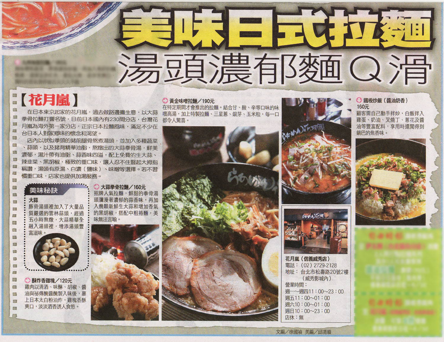 在日本東京起家的花月嵐,過去做路邊攤生意,以大蒜拳骨拉麵打響名號,目前日本國內有230間分店,台灣花月嵐為海外第一家分店,正宗日本國內拉麵風味,滿足不少在台日本人對家鄉味的懷念和渴望。 店內以狀似拳頭的豬前腿骨熬煮湯頭,並加入多種蔬菜、蒜頭,以及豬背精華油脂、熬燉出的大蒜拳骨湯,鮮美濃郁,湯汁帶有油脂、蒜香味四溢,配上免費生大蒜、辣韭菜、黑胡椒,極致的重口味,讓人忍不住豎起大拇指稱讚,湯頭有原湯、白濃(鹽味)、味噌等選擇。若不習慣重口味,店家也提供加湯服務。