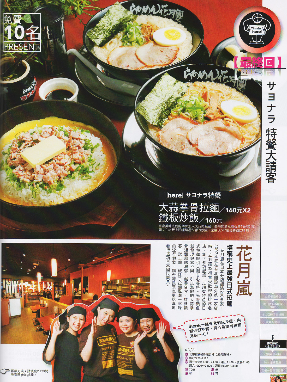 花月嵐在日本分店超過200多家,2007年底在台北開設海外第一家店時,立刻躍為相當受歡迎的排隊名店,創下多項紀錄! 以超有特色的日式拉麵吸引人潮甘心等待。光看顏色就發現與眾不同,引以為傲的大蒜拳骨湯頭風味濃郁,鹹香合宜,許多顧客一試上癮,破除了拉麵風潮一窩蜂的流行假象,讓台灣民眾也更認真地看待這樣日本國民美食。
