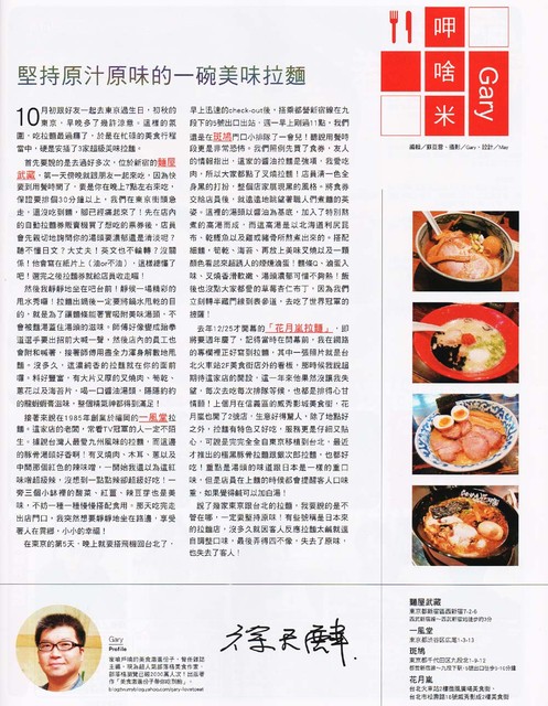 說了幾家東京跟台北的拉麵,我要說的是不管在哪,一定要堅持原味!有些號稱是日本來的拉麵店,沒多久就因客人反應拉麵太鹹就逕自調整口味,最後弄得四不像,失去了原味,也失去了客人!