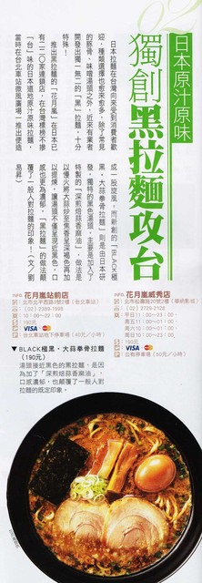 推出黑拉麵的「花月嵐」在日本已有二二○家連鎖店,在台灣標榜不掺「台」味的日本道地原汁原味拉麵,當時在台北車站微風廣場一推出便造成一股旋風。而新創的「BLACK極黑‧大蒜拳骨拉麵」則是由日本研發,獨特的黑色湯頭,主要是加入了特製的「深煎焙蒜香麻油」,做法是以慢火將大蒜炒至焦香呈深褐色再加以提煉,讓湯頭不僅呈現近黑色,口感也更為濃郁,「黑拉麵」的做法顛覆了一般人對拉麵的印象!