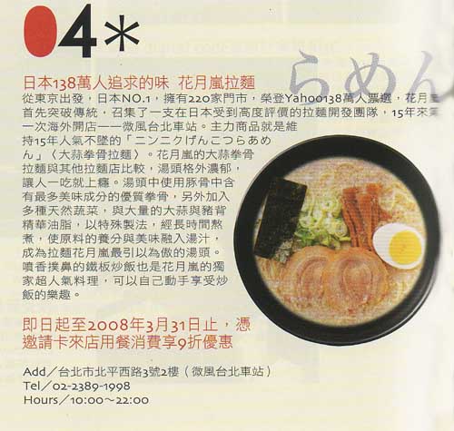 從東京出發,日本No.1,擁有220家門市,榮登Yahoo138萬人票選, 花月嵐首先突破傳統,召集了一支在日本受到高度評價的拉麵開發團隊,15年來第一次海外開店─微風台北車站。 主力商品就是維持15年人氣不墜的「二ン二クげんこつらあめん」(大蒜拳骨拉麵)。
