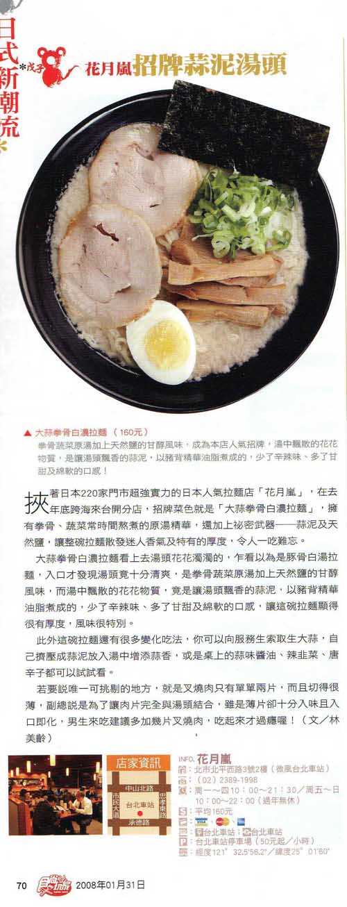 挾著日本220家門市超強實力的日本人氣拉麵店「花月嵐」, 在去年底跨海來台開分店,招牌菜色就是「大蒜拳骨白濃拉麵」, 擁有拳骨、蔬菜常時間熬煮的原湯精華,還加上祕密武器蒜泥及天然鹽, 讓整碗拉麵散發迷人香氣及特有的厚度,讓人一吃難忘。