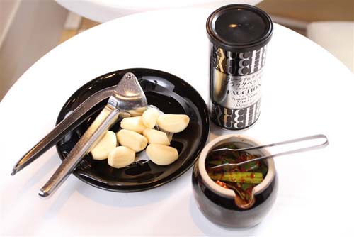 不過粉絲們要推薦的還有「花月嵐三寶」,第一是香氣高雅的巴黎老牌黑胡椒,一定要大把大把灑在拉麵或炒飯上,香氣逼人。第二是生鮮大蒜,提供給客人現擠的辛辣口感,整碗拉麵層次將更豐富。第三是嗆辣韭菜,每天新鮮現做,否則出水影響口感,這久韭菜醃拌的辣醬獨家漬物,可讓拉麵頓時變得「激辣」。