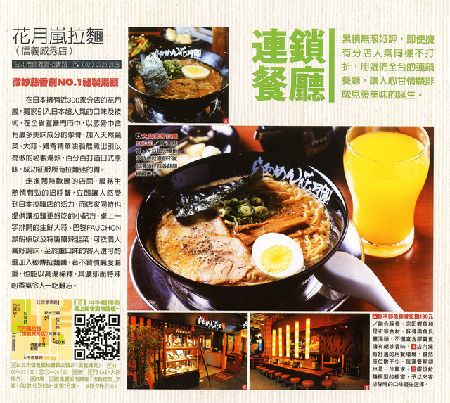 在日本擁有近300家分店的花月嵐,獨家引入日本超人氣的口味及技術,在全省直營門市中,以豚骨中含有最多美味成分的拳骨,加入天然蔬菜、大蒜、豬背精華油脂熬煮出引以為傲的祕製湯頭,百分百打造日式原味,成功征服所有拉麵迷的胃。