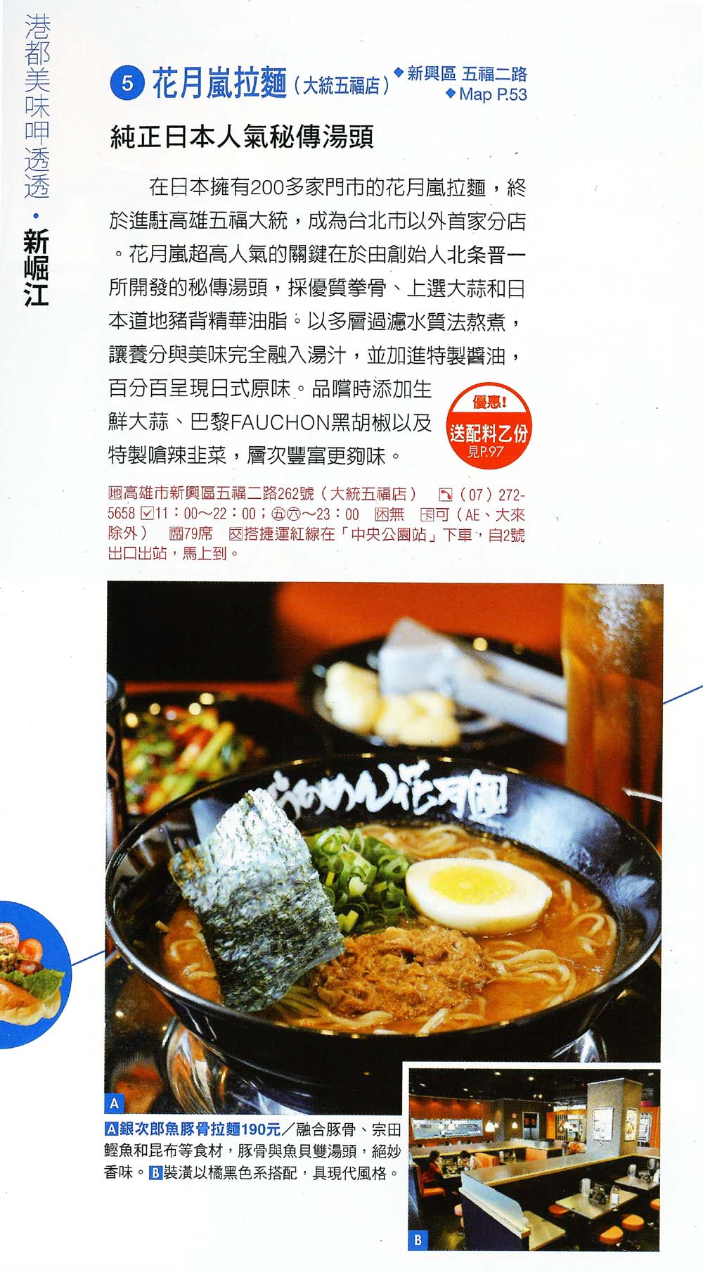 在日本擁有200多家門市的花月嵐拉麵,終於進駐高雄五福大統,成為台北市以外首家分店。 花月嵐超高人氣的關鍵在於由創始人北条晋一所開發的秘傳湯頭,採優質拳骨、上選大蒜和日本道地豬背精華油脂。 以多層過濾水質法熬煮,百分百呈現日式原味。品嚐時添加生鮮大蒜、巴黎FAUCHON黑胡椒以及特製嗆辣韭菜,層次豐富更夠味。
